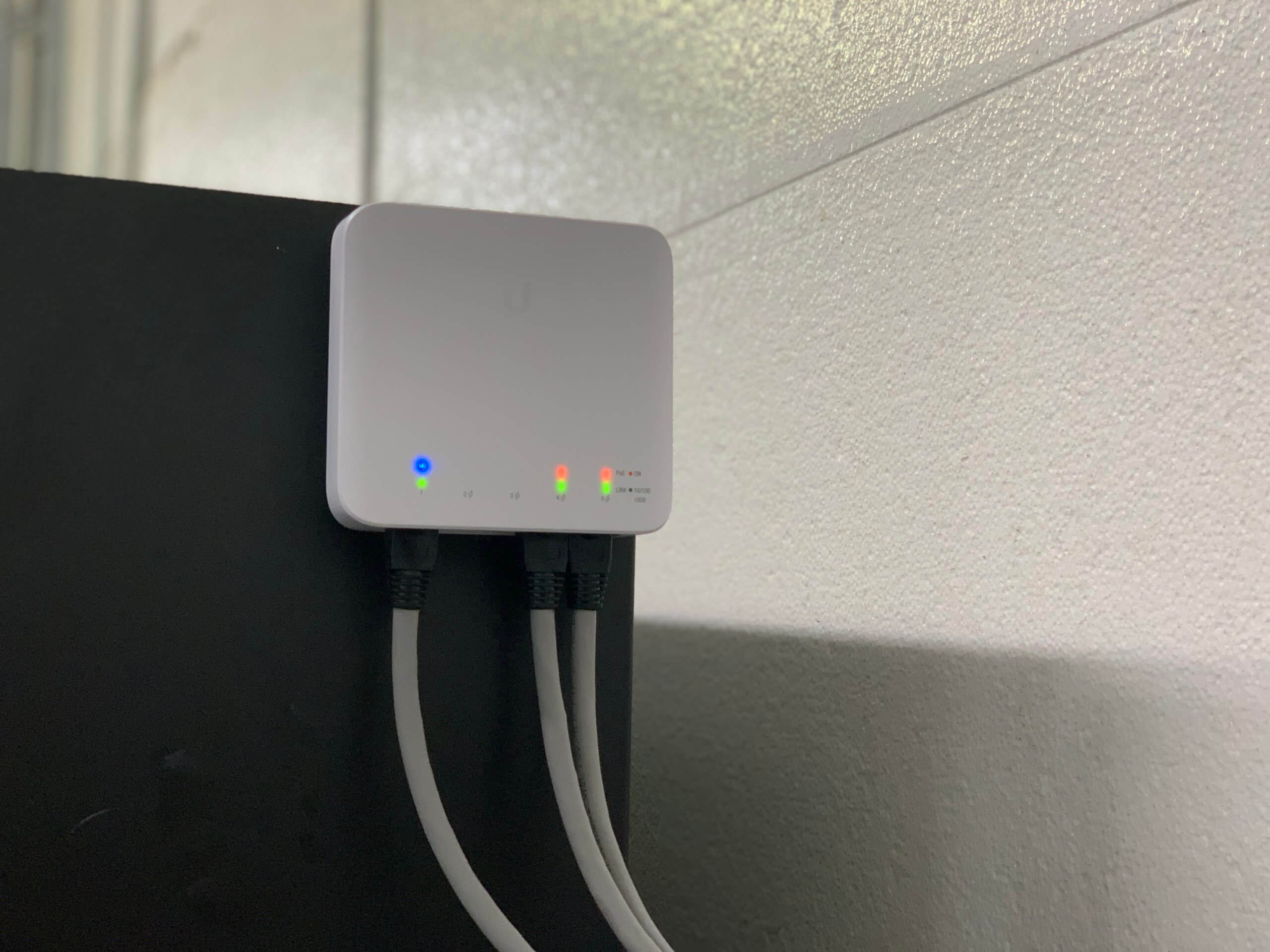 Thankfully, the main building already had structured cabling from a previous renovation. There were CAT5e drops just about everywhere. The location of the service point from the ISP didn’t really have a good spot to put any kind of rack, but we cleaned up the cabling as best we could and installed a USG 3 and a 24 port 250w switch to facilitate VoIP phones in the future.