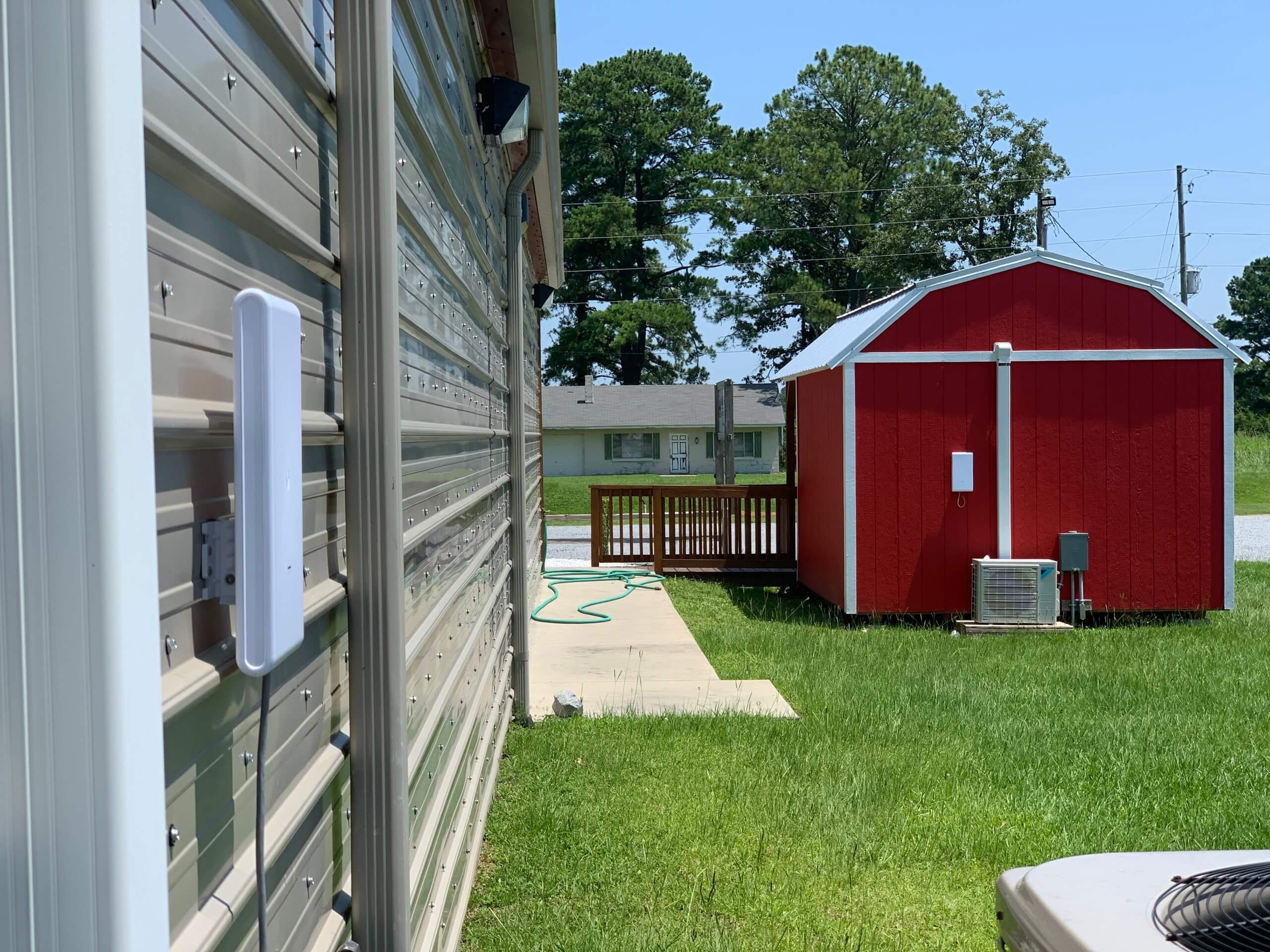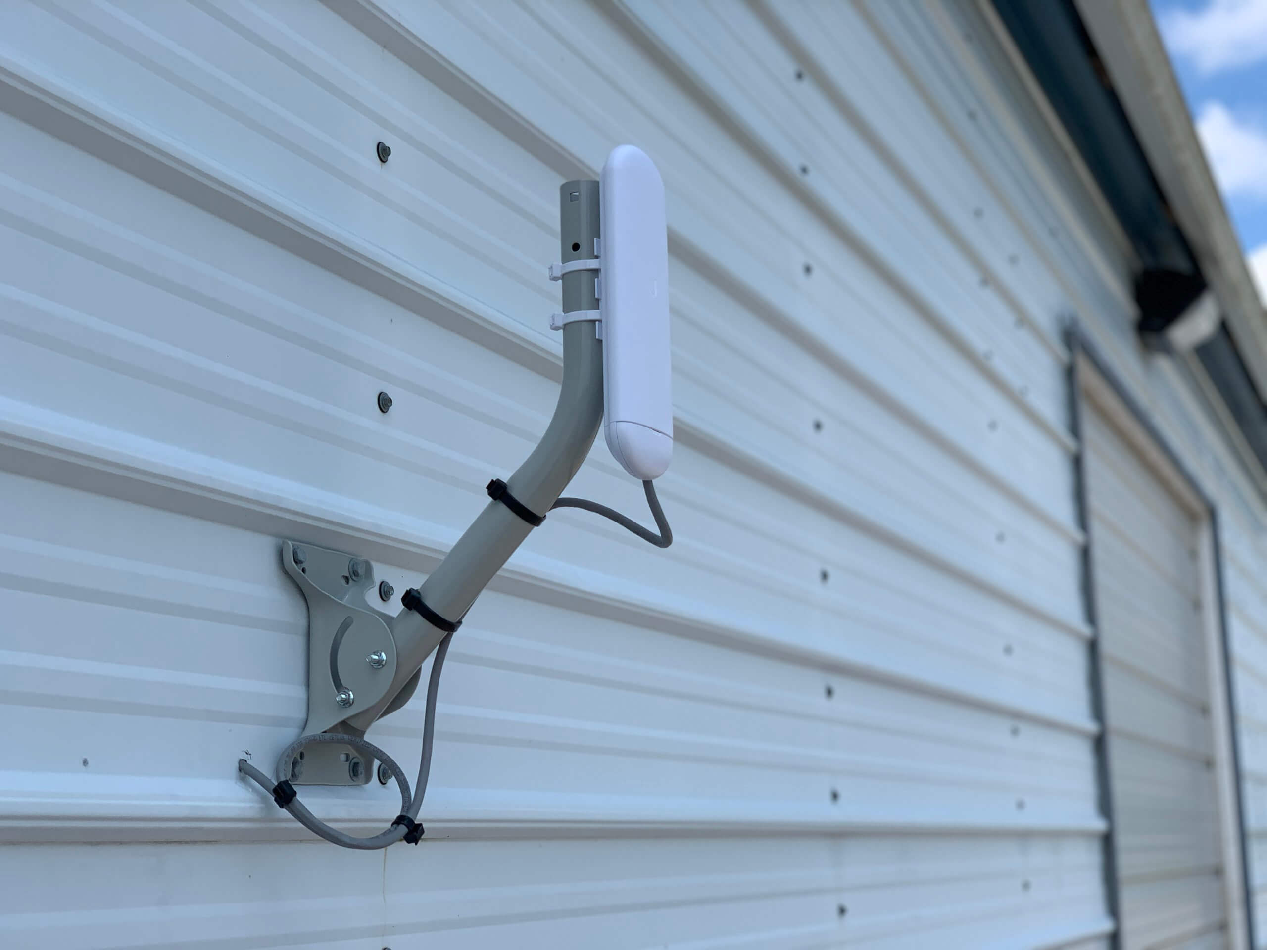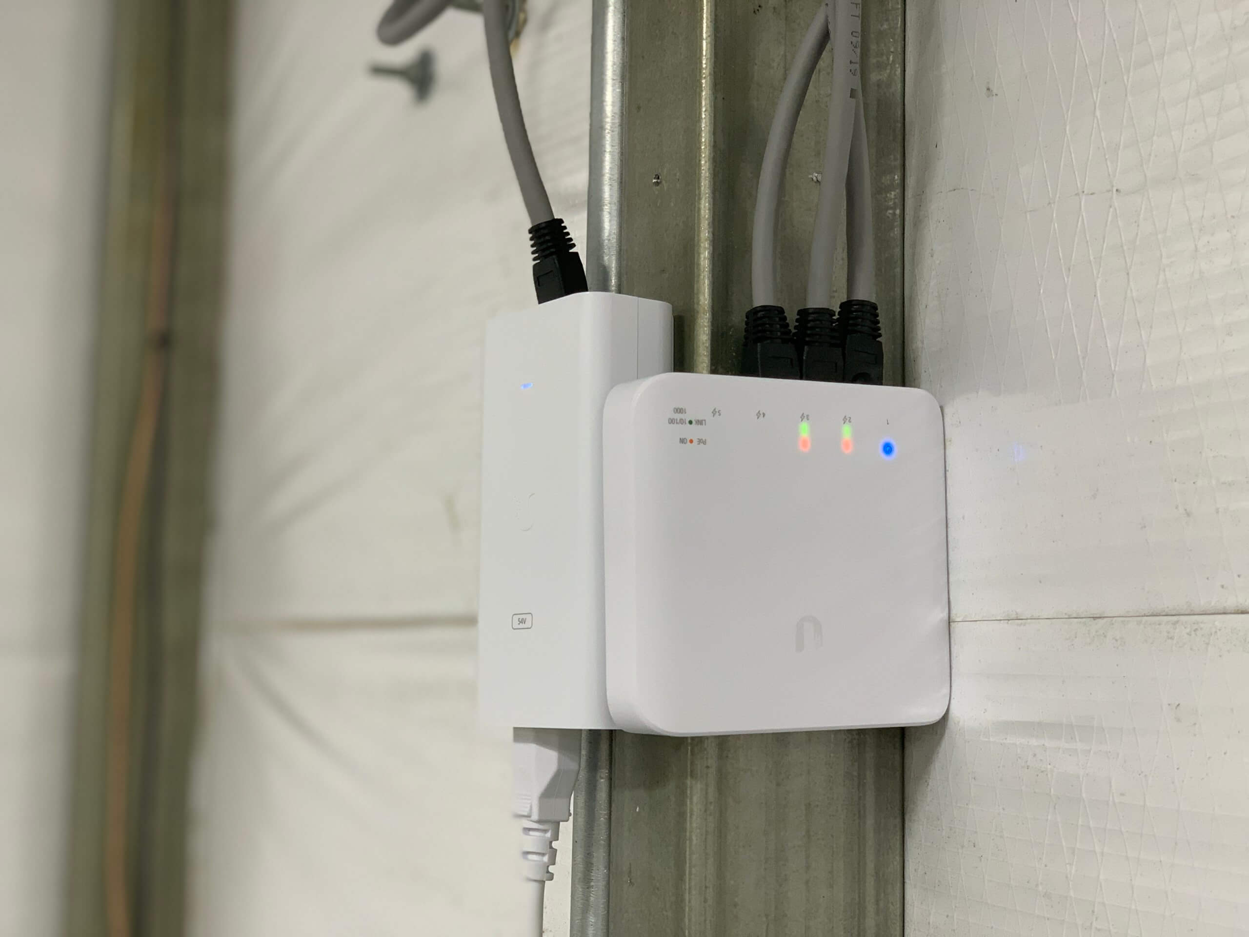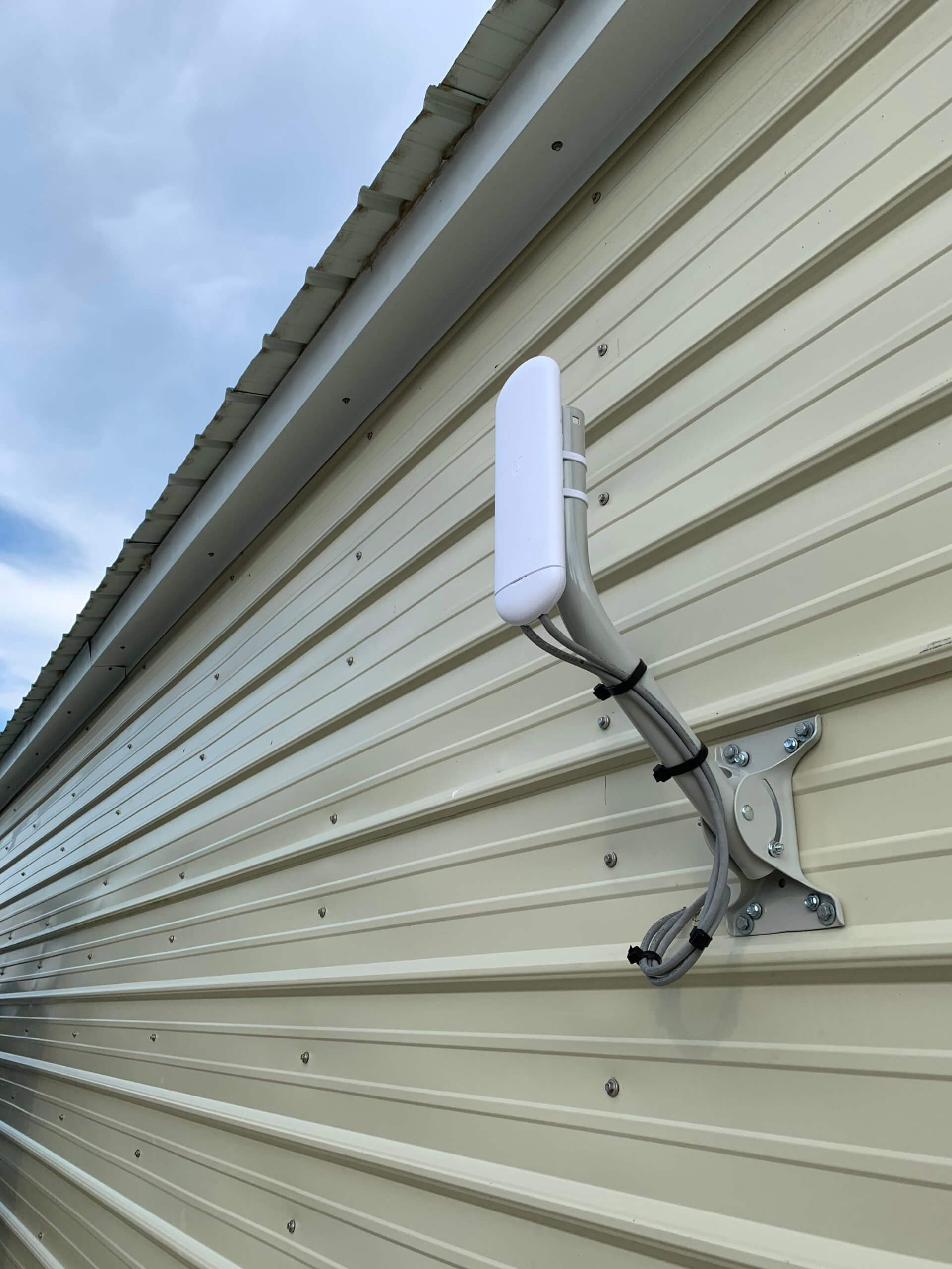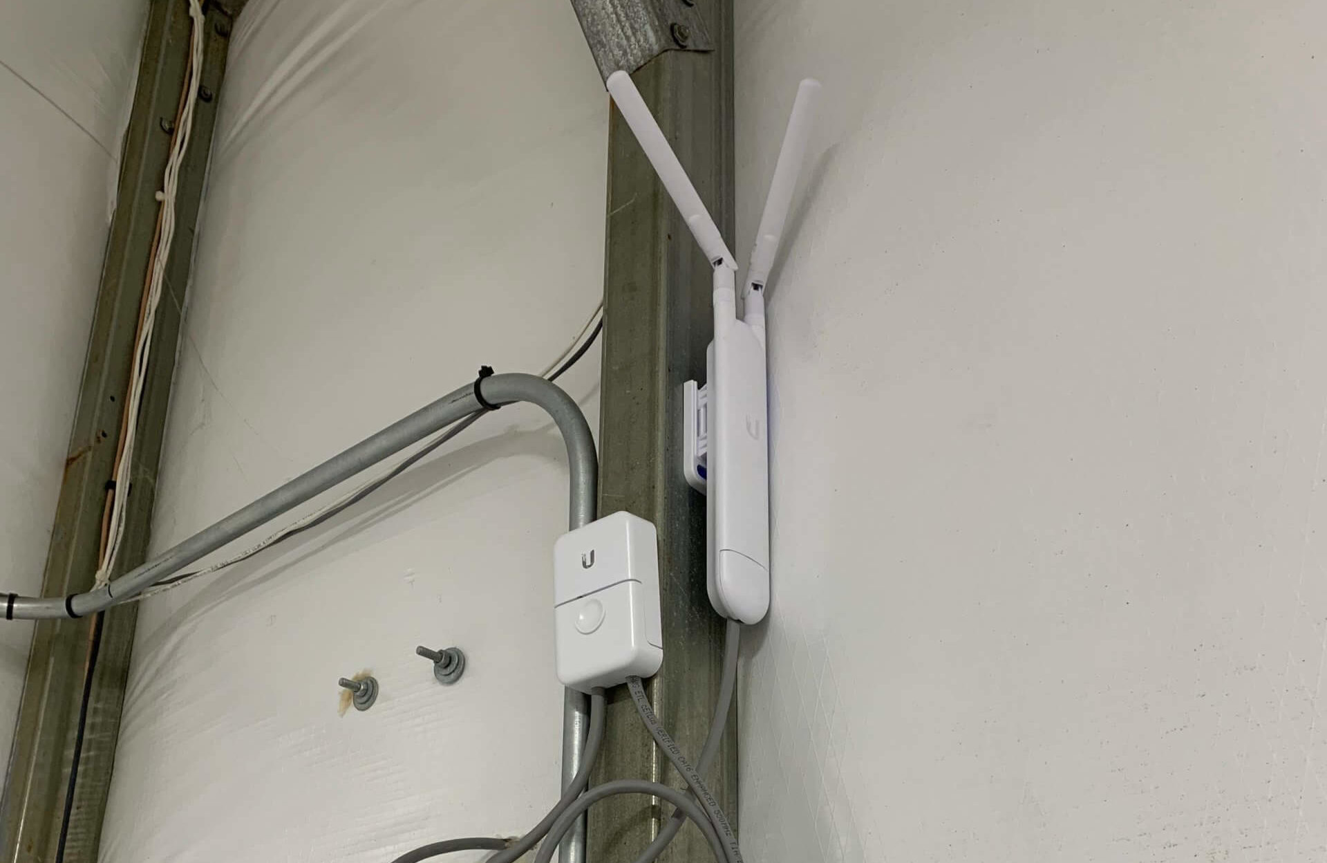 To do this, we utilized the UniFi Flex Switch. The switch was powered by the 8 port 150W switch in the main building. Out of this switch we were able to power a Mesh point antenna for wireless in the building and a Nanostation AC antenna outside the building to bridge the connection to the building on the far side of the property. Metal buildings aren’t exactly the easiest to mount equipment in, but this worked out ok: